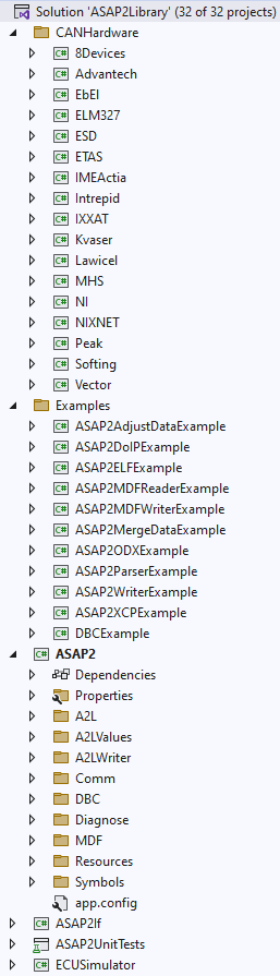 The ASAP2Library is exclusively implemented in C# and may be compiled as .NET Framework 4.x or .NET 8/9 Assembly. The ASAP2Library may be used with any .NET supported programming language (C#, F#, VB.NET, managed C++, …).
